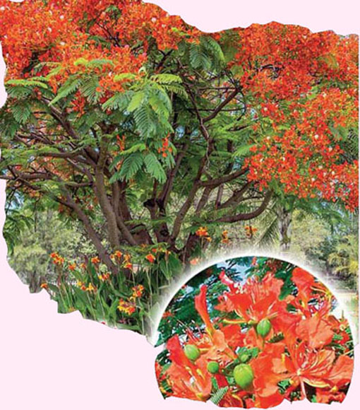 Płomień Afryki to drzewo tworzące, w naturalnych warunkach, rozłożystą, parasolowatą koronę. Wysokość do 9m, szerokość od 5 do 10m. Liście ciemnozielone, długie, podwójnie pierzasto złożone.