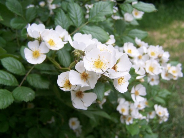 Róża wielokwiatowa, sadzona bez podpór tworzy szerokie, wysokie (do 3m) i rozłożyste krzewy o zwisających, zielonych lub wiśniowych pędach, pokrytych krótkimi, hakowatymi kolcami. Prowadzona przy podporach może zachowywać się jak róża pnąca. Wówczas potrafi osiągać nawet 7 metrów wysokości. Liście, złożone z 7-9 listków, są ciemnozielone, matowe lub lekko błyszczące, bardzo długo utrzymują się na pędach, a jesienią mogą przebarwiać się niezwykle dekoracyjnie, przybierając barwę żółtą lub pomarańczową.Niewielkie, pojedyncze, drobne kwiaty (około 2 cm) są skupione w wielokwiatowe, duże wiechy kwiatostanowe. Są one białe lub nieco zaróżowione i kwitną obficie, na dwuletnich pędach, od czerwca do końca lipca. Dodatkowo bardzo intensywnie pachną. Po przekwitnięciu roślina zawiązuje na pędach bardzo duże ilości drobnych, kulistych, czerwonych owoców, które zdobią roślinę niekiedy aż do wczesnej wiosny. Róża wielokwiatowa jest dość odporna na mróz, ale w surowe, bezśnieżne zimy, jej pędy mogą przemarzać, dlatego warto ją kopczykować na zimę. Poza tym, należy do roślin mało wymagających. Dobrze rośnie w pełnym słońcu. Toleruje mniej zasobne gleby i okresowe susze.