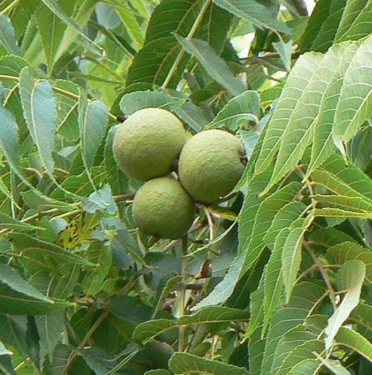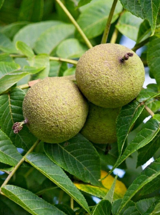 Owoce orzecha czarnego mają twardą, ciemną skorupę i są otoczone grubą, zieloną łupiną.
